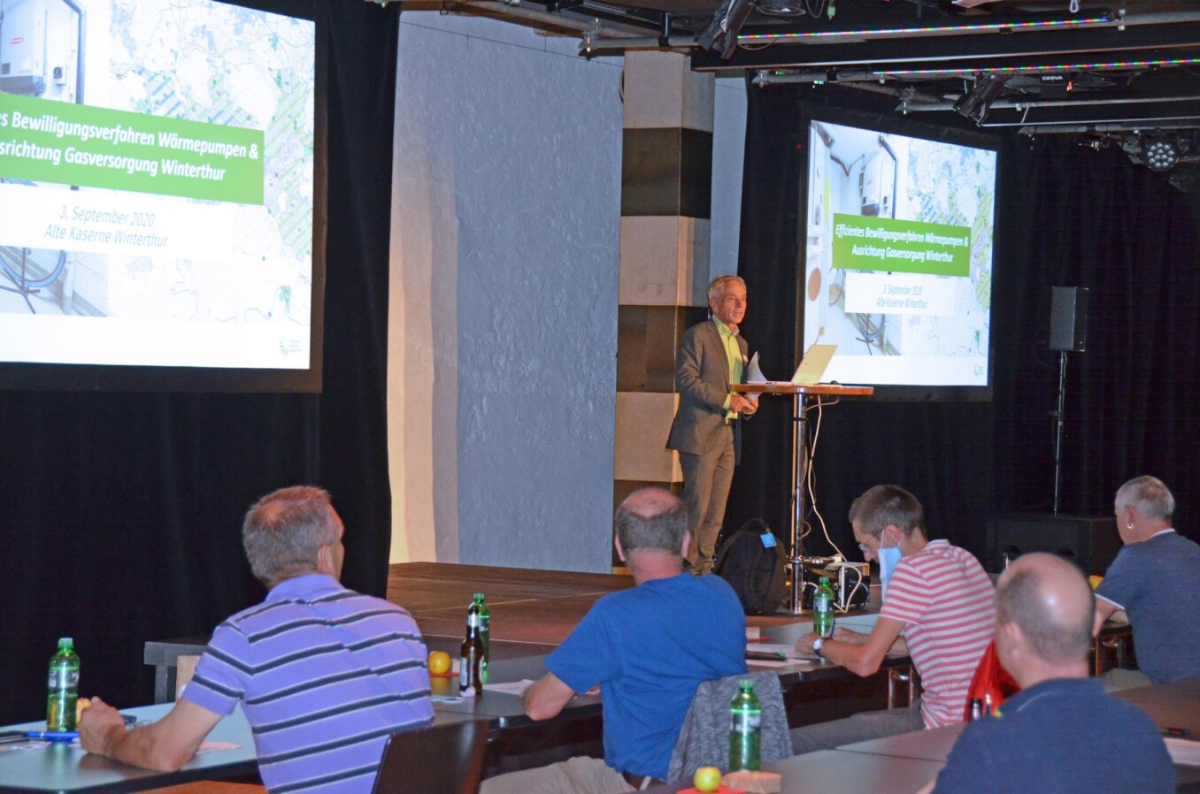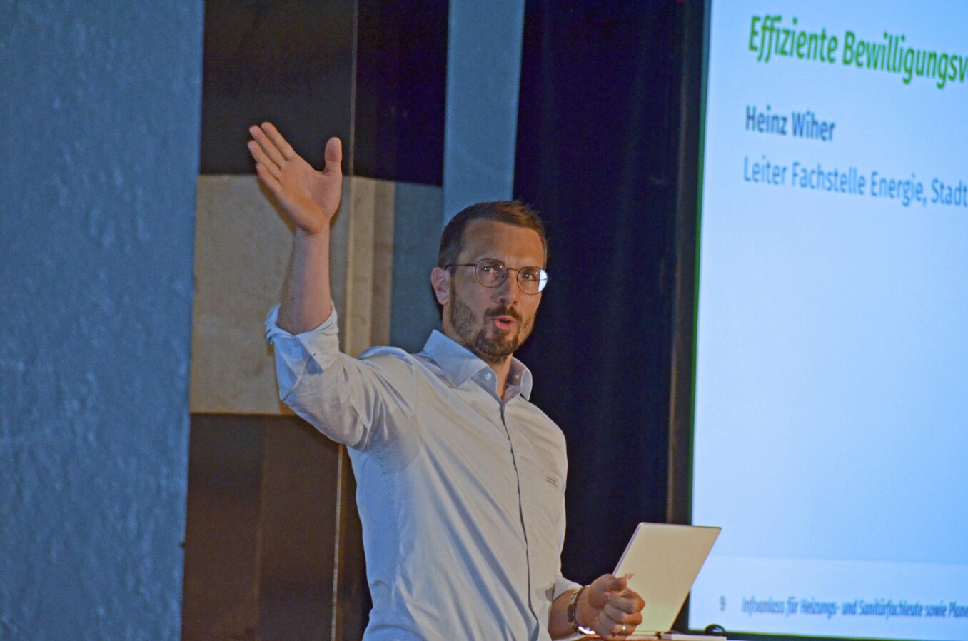 Heinz Wiher, Leiter Fachstelle Energie der Stadt Winterthur, begrüsste die Offensive des Kantons und forderte die anwesenden Fachleute auf, ihre Kunden auf das seit Juli laufende kantonale Förderprogramm hinzuweisen. Er informierte über vereinfachte Abläufe bei der Stadt und wies darauf hin, dass in Winterthur der Sicherheitszuschlag bei den Lärmemissionen in der Nacht nicht mehr gelte.