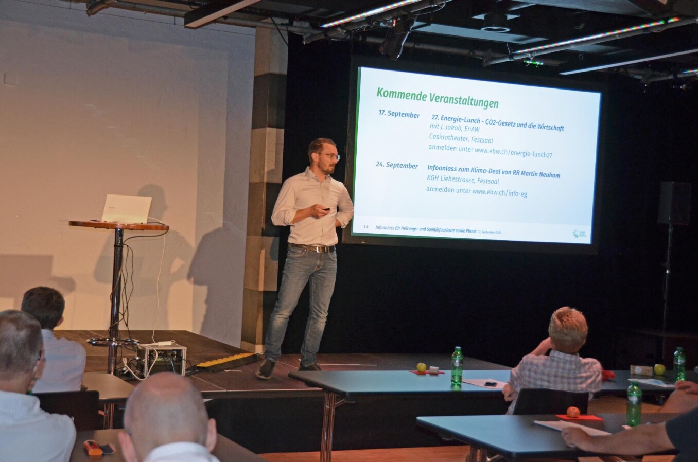 Der Klima-Deal von Baudirektor Martin Neukom wird zukunftsgerichteten Heizungssystemen wie der Wärmepumpe weiteren Schub verleihen. Für die Installation und den Betrieb einer Wärmepumpe - im Neubau oder als 1:1-Ersatz – ist eine Baubewilligung erforderlich. Welche Dokumente dazu eingereicht werden müssen und welches Bewilligungsverfahren bei Luft/Wasser-Wärmepumpen und Erdsonden-Wärmepumpen notwendig ist, erfuhren die rund 45 Besucher des Infoanlasses.