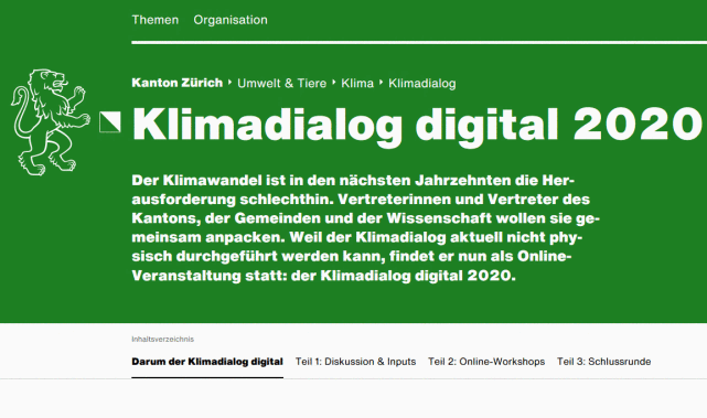 Zürich, 4. Dezember 2020 - Im eigentlichen Herzstück des Klimadialogs, den 11 Online-Workshops, beschäftigten sich die Gemeindevertreterinnen und –vertreter zusammen mit Fachleuten von Kanton, Städten, Gemeinden und Bund mit konkreten Fragestellungen, welche die Städte und Gemeinden im Zusammenhang mit den Herausforderungen des Klimawandels beschäftigen. Die Themen reichten von Wärmeverbünden und erneuerbaren Energien über die Förderung von E-Mobilität bis zur Frage, wie man die Bürgerinnen und Bürgern zu Beteiligten machen kann.