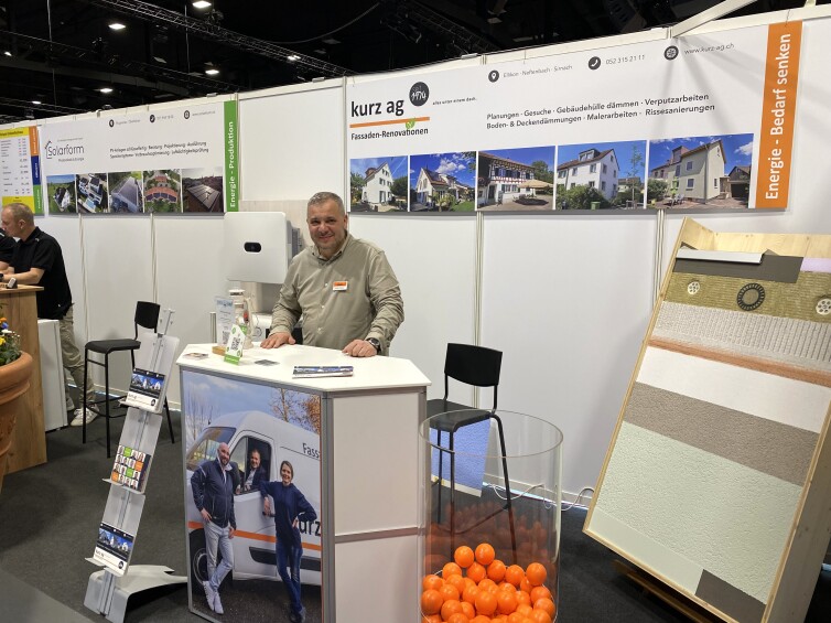 Ähnliches bestätigt auch Claudio Privitera, Geschäftsführer der Kurz Renovations AG, der seinen Stand unweit aufgestellt hat. Sein Unternehmen ist auf Fassadenrenovationen spezialisiert. Mit einer Schaumodellwand werden die verschiedenen Schichten einer Fassade veranschaulicht – ein effektives Mittel, um Kund:innen komplexe Bauprozesse verständlich zu machen. Als sympathisches Detail verteilt er zudem leuchtend orange Knetbälle, die sinnbildlich für das Motto stressfrei bauen stehen sollen. „Wir wollen unseren Kund:innen dieses Gefühl vermitteln – eine ruhige, lösungsorientierte Zusammenarbeit ohne Hektik“, sagt Claudio Privitera mit einem Lächeln. Die Idee kommt an – sie bleibt hängen und sorgt für Gesprächsstoff.
