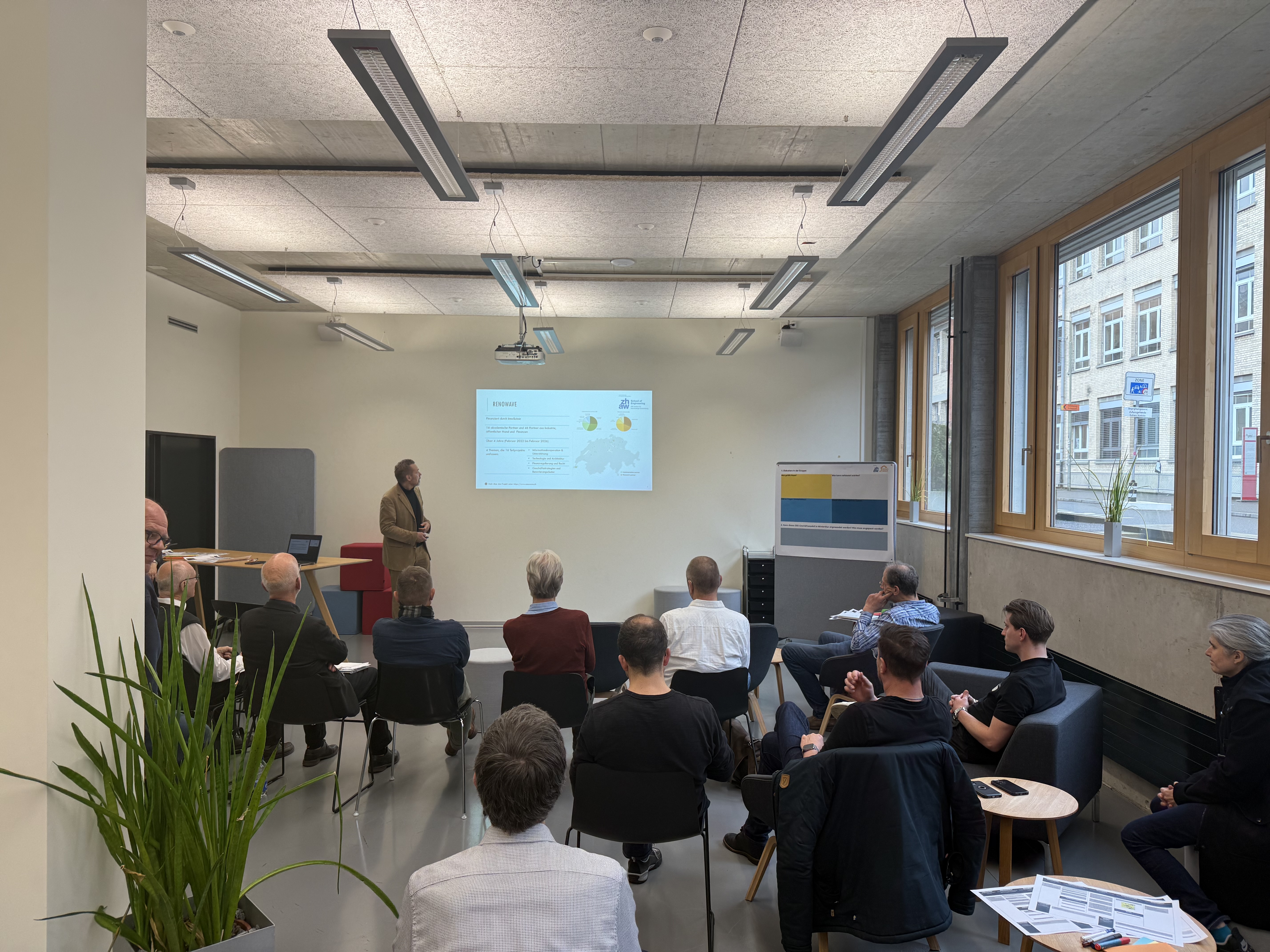 RENOWAVE, ein von Innosuisse gefördertes Flagship-Projekt, verfolgt das Ziel, die CO₂-Emissionen im Schweizer Gebäudesektor durch umfassende Sanierungen und den Wechsel zu erneuerbaren Energien zu senken. Der Workshop legte den Fokus auf den „One-Stop-Shop“-Ansatz, der Hausbesitzenden eine zentrale Anlaufstelle für sämtliche Fragen rund um Sanierungen bieten soll.